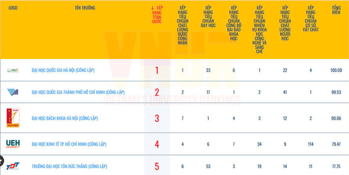 Theo bảng xếp hạng, Đại học Quốc gia Hà Nội và Đại học Quốc gia TP.HCM tiếp tục giữ vị trí 1 và 2.