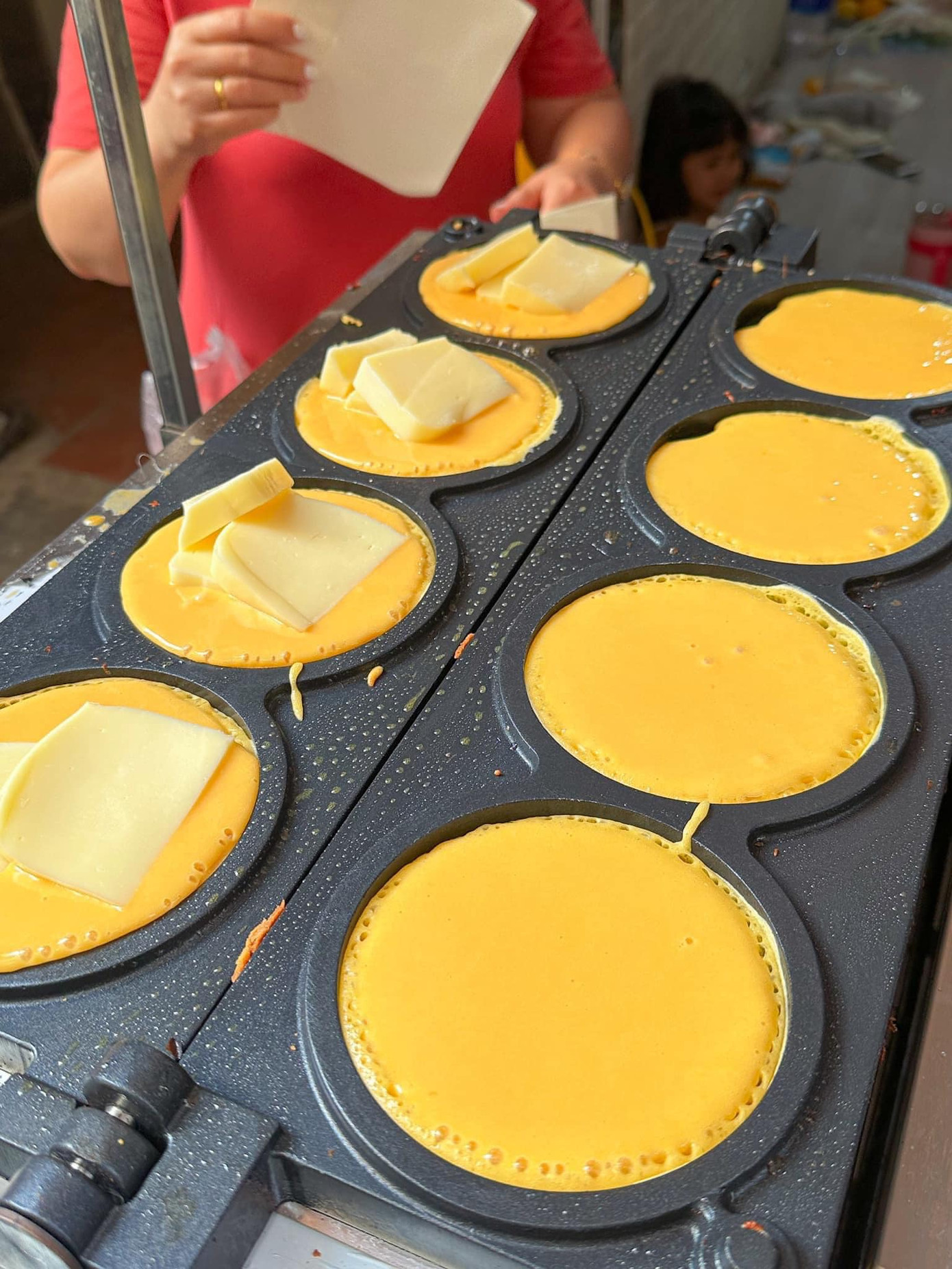 Bánh có đường kính khoảng 10 cm, vỏ bánh được nướng vàng, mỏng, thơm, mềm hương vani, có vị gần giống bánh trứng gà non. Bên trong là đẫm nhân phô mai mozzarella, có thể kéo sợi dài cả mét (đó là nếu bạn kéo cẩn thận và có "skill"). Một số nơi biến tấu có thêm nhân phô mai kèm ngô ngọt.