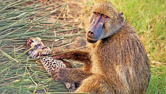 Đây là một khoảnh khắc cực hiếm trong thế giới động vật hoang dã, bởi khỉ đầu chó và báo hoa mai là kẻ đối địch với nhau.