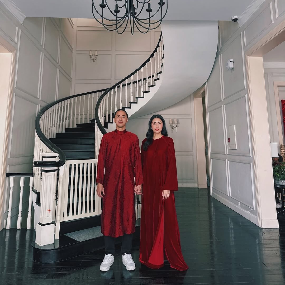 Cứ đến mùng 1 Tết hằng năm, Tăng Thanh Hà đều khoe ảnh mặc áo dài, cùng chồng chụp bức ảnh đón Xuân. Năm nay, cô dâu hào môn chọn áo dài đỏ đun đầy sang trọng và vẫn chung thủy với thiết kế cổ tròn, tay loe.