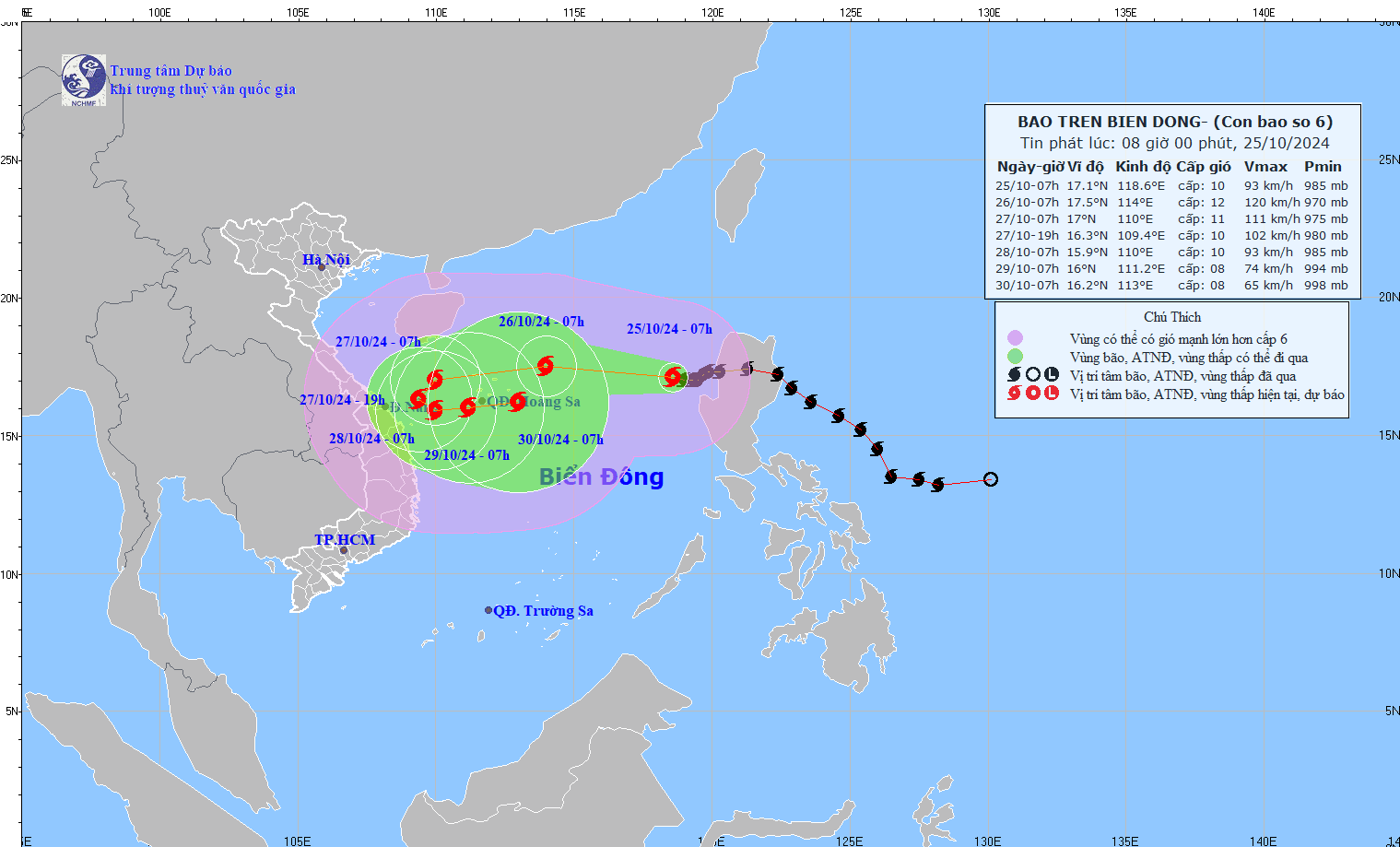 Theo Trung tâm dự báo Khí tượng thủy văn Trung ương, hồi 16h ngày 26/10, vị trí tâm bão ở vào khoảng 17,0 độ Vĩ Bắc; 111,5 độ Kinh Đông, trên vùng biển phía Tây Bắc quần đảo Hoàng Sa, cách Đà Nẵng khoảng 370 km về phía Đông Đông Bắc. Sức gió mạnh nhất vùng gần tâm bão mạnh cấp 11 (103-117km/h), giật cấp 14. Di chuyển theo hướng Tây, tốc độ khoảng 20km/h.