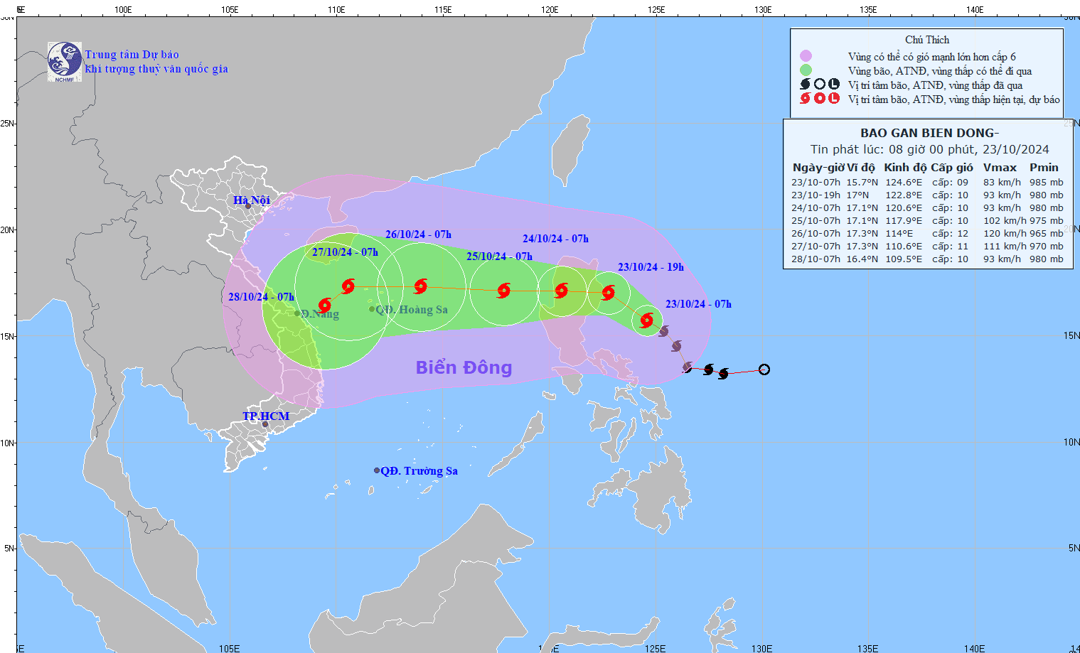 Theo Trung tâm Dự báo Khí tượng Thủy văn Quốc gia, hồi 7h ngày 25/10, vị trí tâm bão số 6 ở vào khoảng 17,1 độ Vĩ Bắc; 118,6 độ Kinh Đông, trên vùng biển phía Đông của khu vực Bắc Biển Đông. Sức gió mạnh nhất vùng gần tâm bão mạnh cấp 10 (89-102km/h), giật cấp 12. Di chuyển theo hướng Tây, tốc độ khoảng 15km/h.