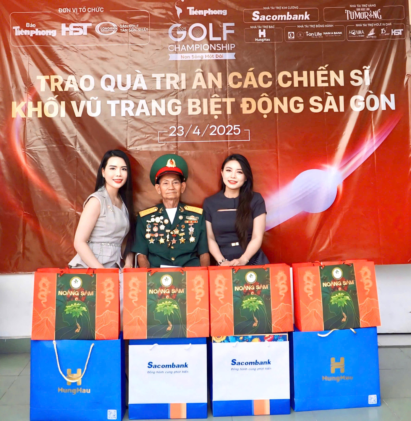 | Anh Trần Ngọc Lâm (trái) - Phó Trưởng Ban đại diện báo Tiền Phong tại TP. HCM, đại diện BTC 'Giải Tiền Phong Golf Championship - Non sông một dải lần thứ nhất năm 2025' trao quà cho bà Lê Thị Chi. |
