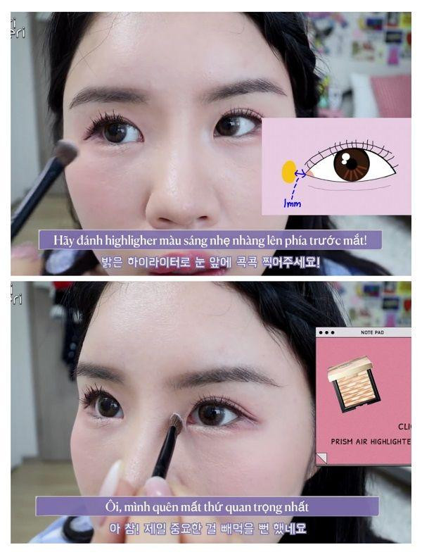Cuối cùng, đánh highlighter màu sáng nhẹ nhàng lên phía trước mắt, cách mắt khoảng 1mm và bạn đã có một đôi mắt trông khá là to tròn rồi, phải không nào?