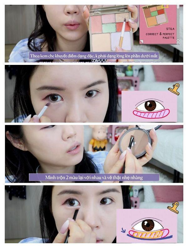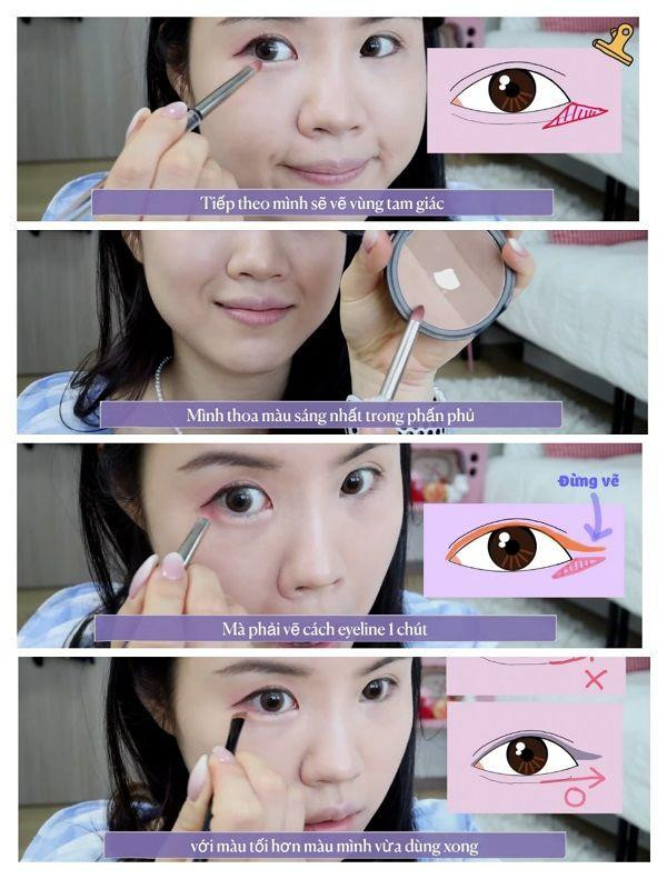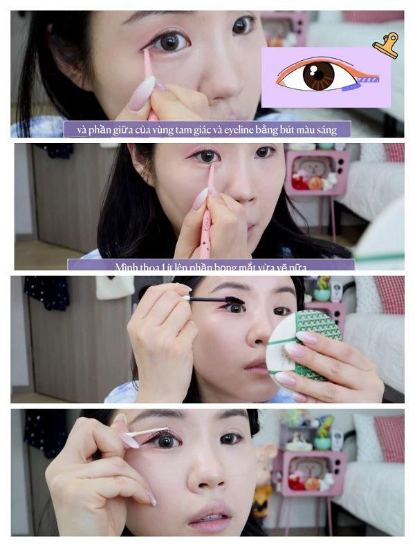 Tiếp theo là vẽ vùng tam giác. Thoa màu sáng nhất trong phấn phủ, vẽ cách eyeline một chút rồi tạo khối nhẹ phần trước mắt với cùng màu. Sau đó vẽ theo một đường thẳng ở phần mắt dưới với màu tối hơn màu vừa dùng xong để tạo cảm giác mắt mở to hơn về phía sau.