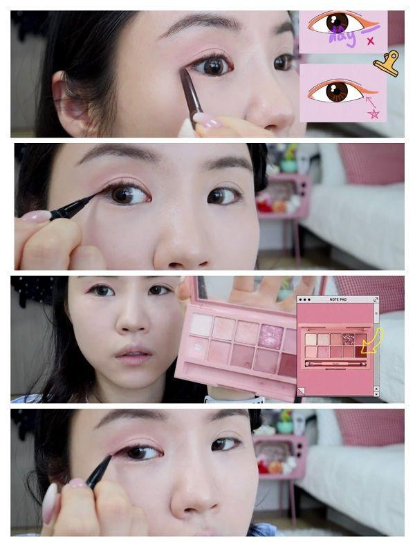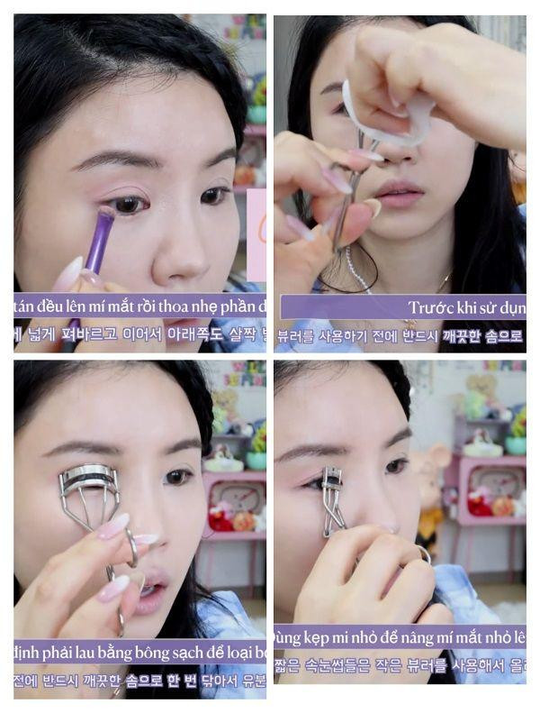 Đây là cách trang điểm theo kiểu trong sáng nên chúng mình chỉ cần dùng một màu phấn mắt tán đều lên mí mắt rồi thoa nhẹ phần dưới mắt, sau đó dùng bông để lau sạch dụng cụ bấm mi trước khi sử dụng để loại bỏ dầu. Tiếp đến, dùng kẹp mi nhỏ để nâng mí mắt nhỏ lên.