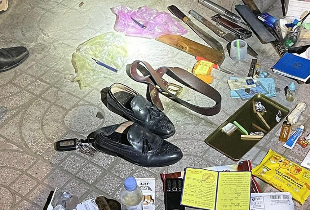 Công an kiểm tra bên trong ô tô phát hiện vỏ bao thuốc bên trong có ống hút màu xanh chứa chất rắn màu hồng và 1 túi ni lông chứa chất bột màu trắng (nghi là ma túy). Quá trình khám xét tại nhà riêng, công an thu giữ thêm nhiều tang vật gồm dao, kiếm và một số dụng cụ dùng để sử dụng ma túy cùng nhiều tang vật liên quan.
