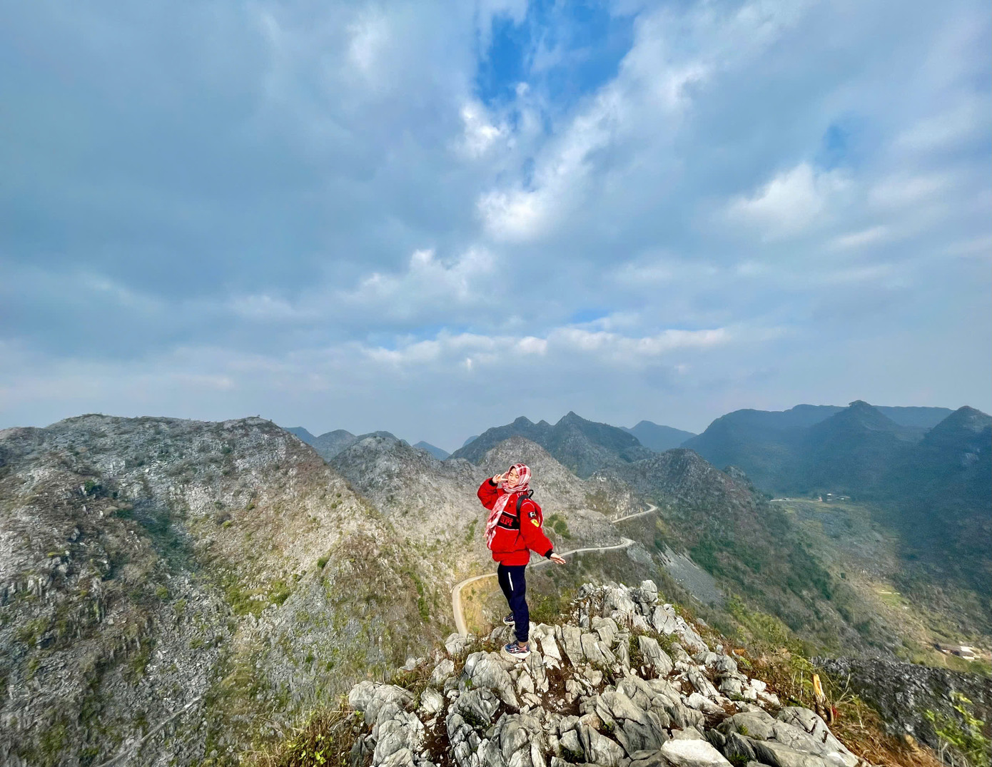 Trong chuyến đi Hà Giang năm nay, Bella Vũ đã cùng gia đình và các thành viên của quỹ Bellalove tham quan nhiều cảnh đẹp ở vùng núi cao. Vách đá trắng là lưng của một ngọn núi thuộc đỉnh đèo Mã Pì Lèng - một trong những con đèo hiểm trở nhất Việt Nam.