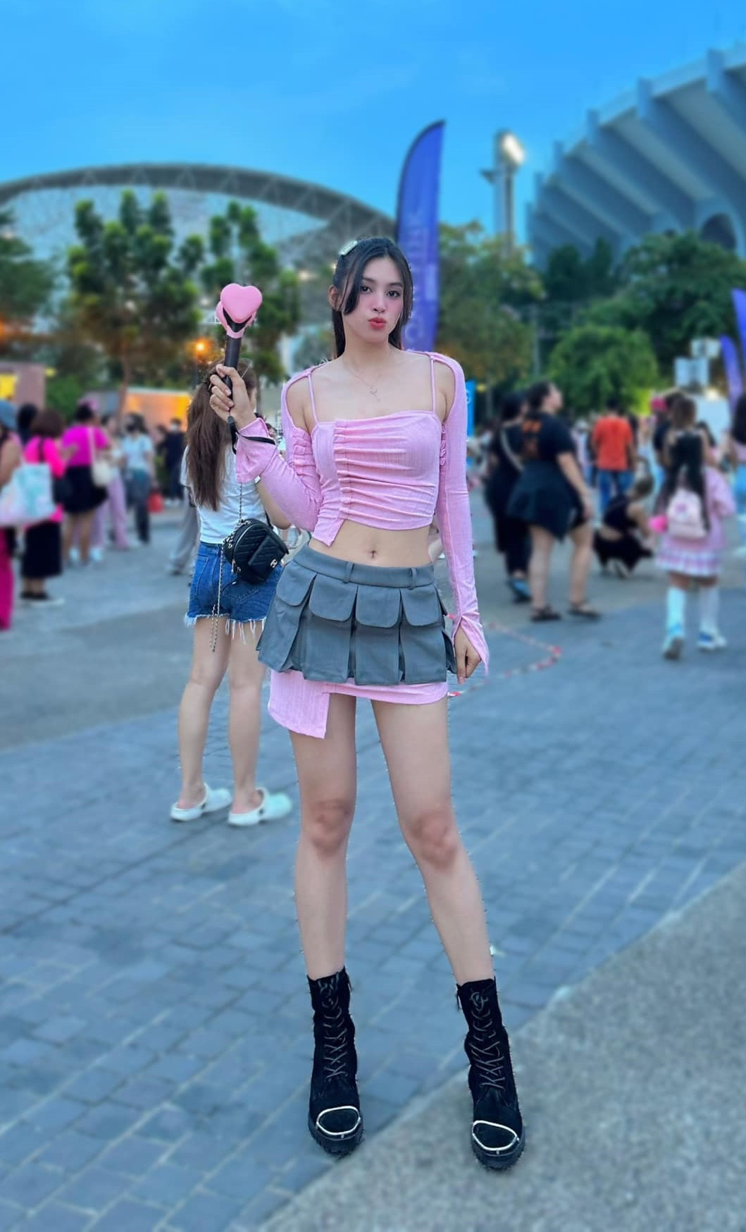 Thay cho váy xẻ cao tít tắp, Tiểu Vy lại rất chuộng chân váy ngắn nhìn trẻ trung, hiện đại. Những bộ váy ngắn như thế này cũng giúp cô khoe được đôi chân thon dài, trắng mịn.