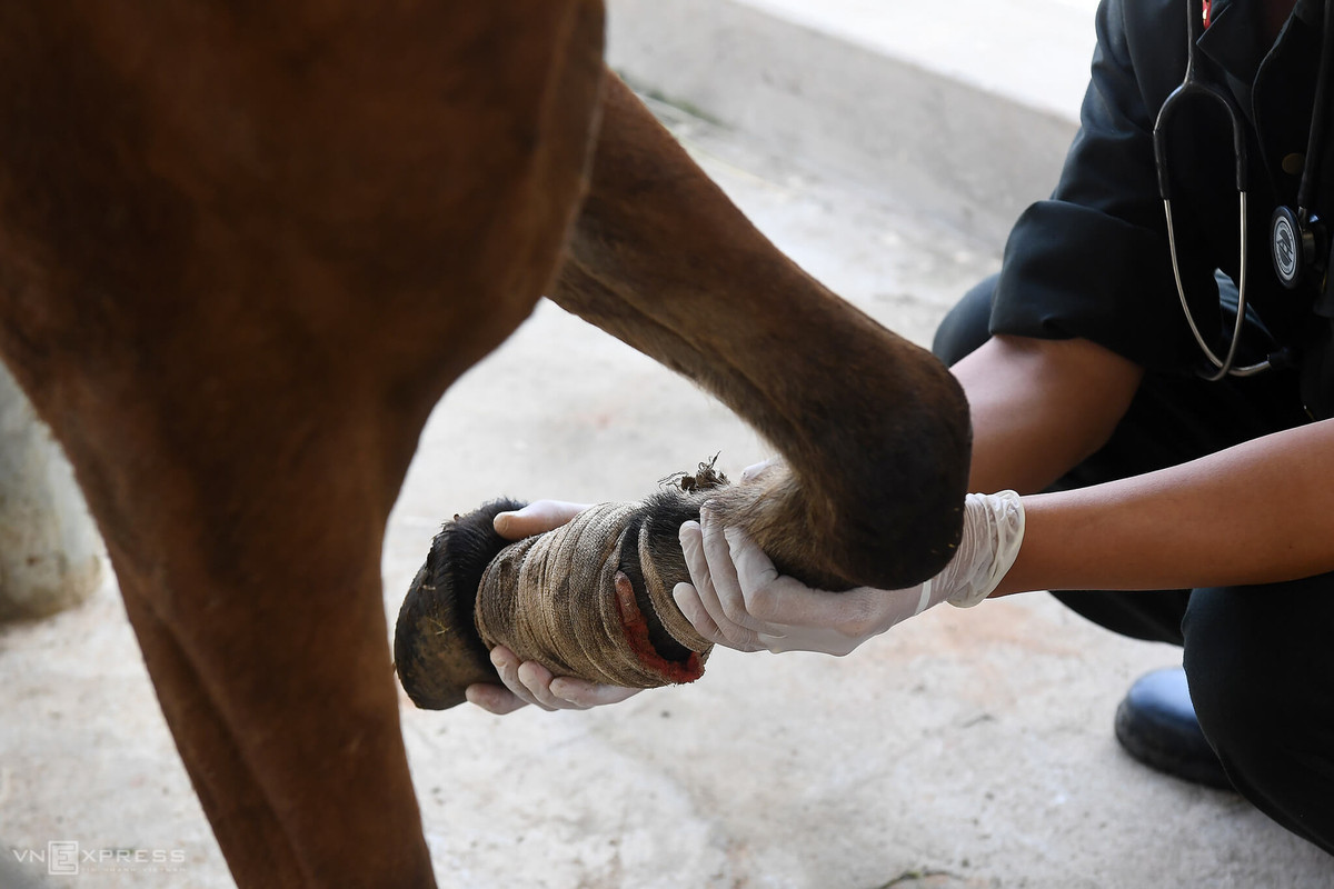 Một con ngựa bị đau chân trong quá trình huấn luyện được bác sĩ thú y thăm khám, sau đó được tiêm thuốc giảm đau và chống viêm.