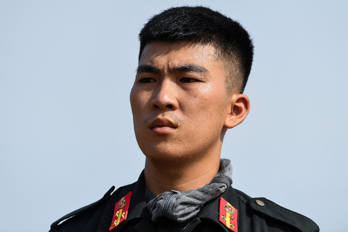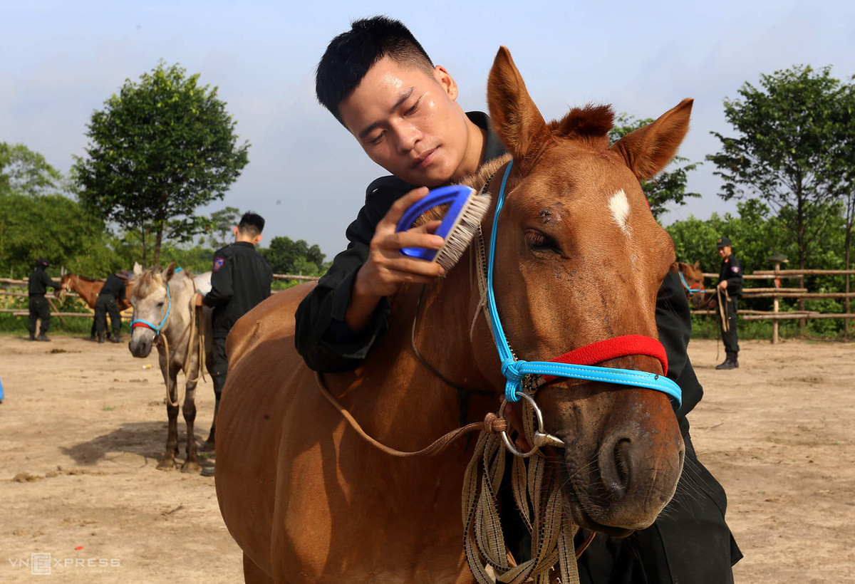 Trước khi ra thao trường, mỗi cảnh sát phải vệ sinh lông cho ngựa của mình bằng bàn chải. Nhẹ nhàng ôm qua cổ ngựa, thượng sĩ Trần Minh Anh, chải kỹ những vết bẩn, bùn trên đầu ngựa và liên tục trò chuyện với con vật để nó đứng nghiêm theo hiệu lệnh.