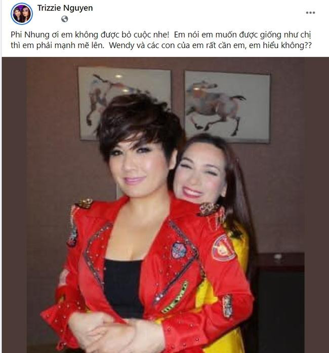 Thông tin bệnh tình của ca sĩ Phi Nhung đang trở nặng khiến các nghệ sĩ, bạn bè và người hâm mộ lo lắng. Nghệ sĩ Việt Hương, Nhật Kim Anh, Hoa hậu Thu Hoài, Trizzie Phương Trinh (vợ cũ nam ca sĩ Bằng Kiều)... đều đồng loạt đăng tải những bài viết động viên, cầu nguyện cho Phi Nhung nhanh chóng khỏi bệnh và trở về vào tối ngày 22/9.