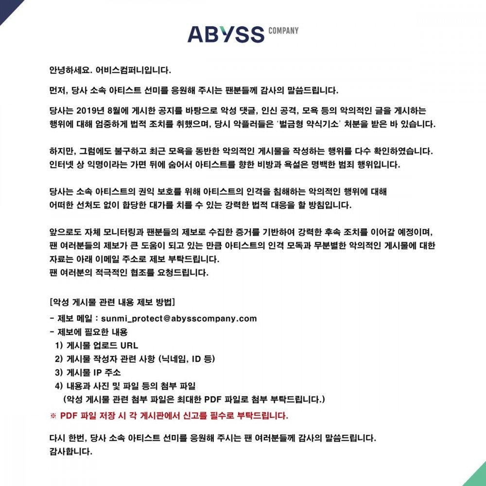 Công ty chủ quản của Sunmi - ABYSS cũng không thể làm ngơ trước sự việc ảnh hưởng trực tiếp đến danh dự và tâm lý của nghệ sĩ. Chiều ngày 13/10, ABYSS đã đưa ra thông báo chính thức, thể hiện rõ lập trường trước những bình luận ác ý nhắm vào Sunmi.