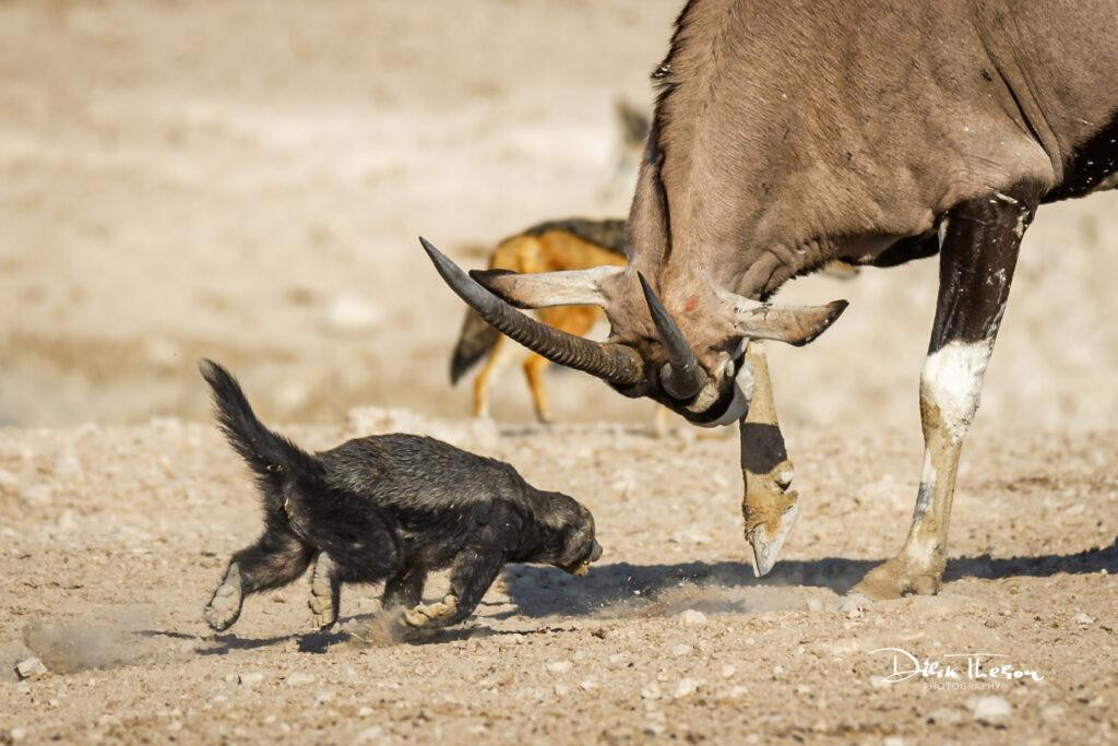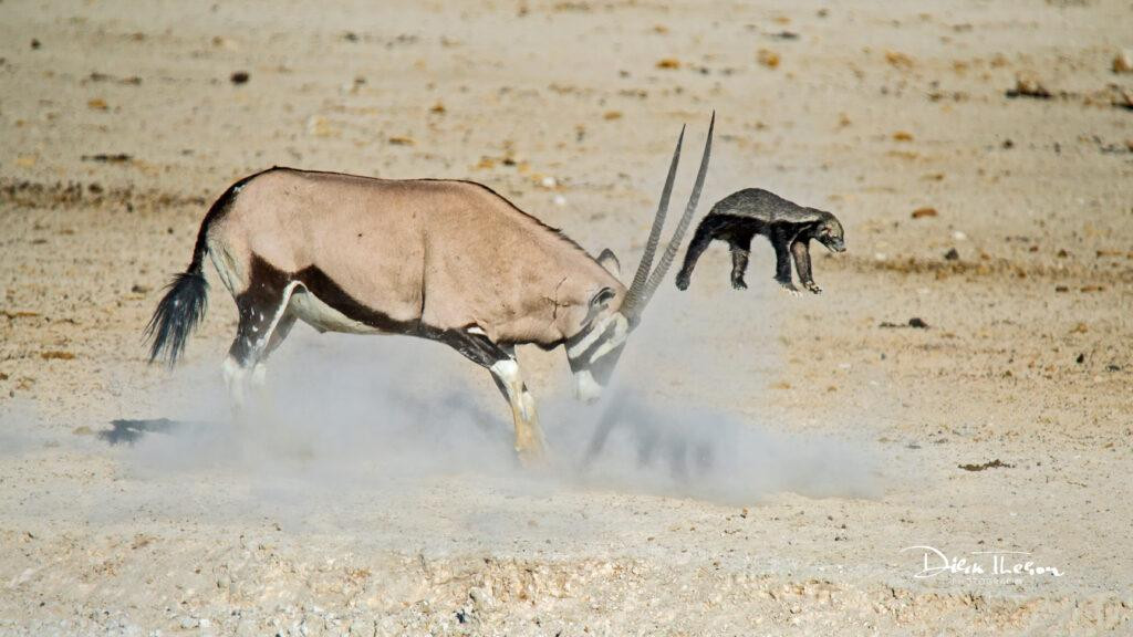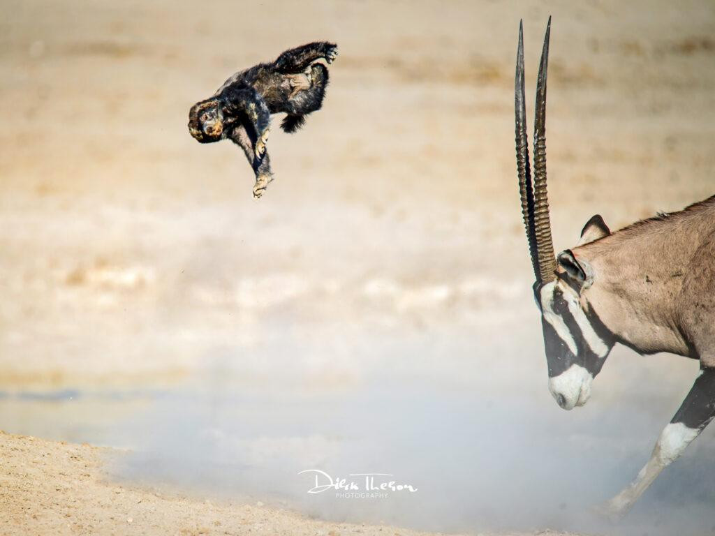 Mới đây, trong lúc đi săn ảnh ở Công viên Quốc gia Etosha, nhiếp ảnh gia Dirk Theron đã ghi lại được cảnh tượng thú vị khi lửng mật bị linh dương Oryx "dạy dỗ", hất tung lên trời.