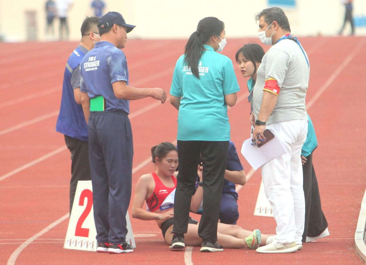 Cô ngã xuống đất với gương mặt đầy đau đớn. Bộ phận y tế đến chăm sóc nhưng Đinh Thị Bích vẫn liên tục khóc vì đau. Người đồng đội Khuất Phương Anh giành HCV với thành tích 2:08.74.