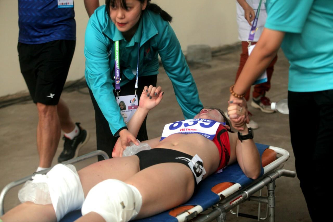 Sau một hồi ăn mừng, Phương Anh biết tin và chạy đến động viên người đồng đội. Cả hai đầu gối của Bích được băng bó nhưng vẫn chưa rõ tình trạng chấn thương của nữ VĐV sinh năm 1997.
