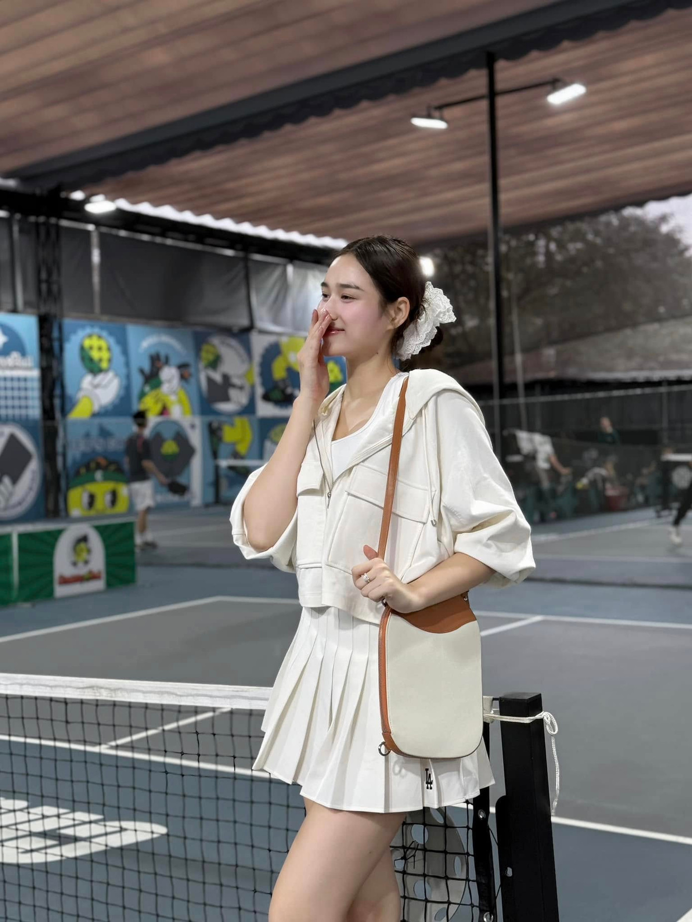 Hoặc thêm một chiếc áo khoác lửng đồng màu với trang phục cũng là lựa chọn thông minh của Hoa hậu Việt Nam 2020, khiến ai cũng công nhận Đỗ Thị Hà chuẩn mỹ nhân mặc đẹp trên sân pickleball.