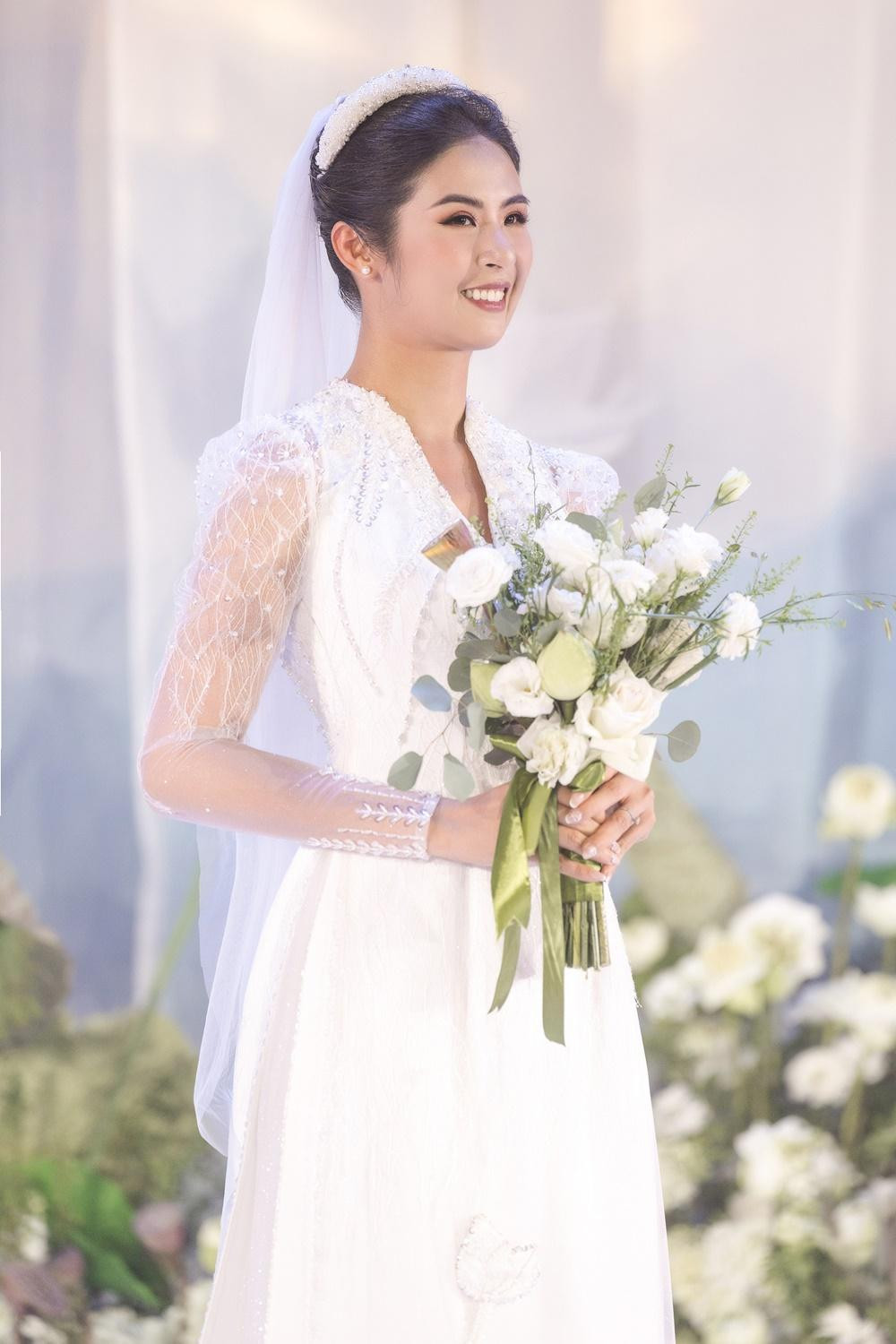 Các chi tiết thêu, đính đá trên bộ áo dài đặc biệt này được làm bằng tay rất tỉ mỉ trong rất nhiều ngày. Ngọc Hân thổ lộ rằng, cô hoàn thiện bộ áo dài cưới này chỉ cách giờ đón khách đúng 2 tiếng. Để hoàn thiện phom dáng dạ hội cho áo dài cưới, hoa hậu phải nhờ đến bạn thân là NTK Hà Duy tư vấn và hỗ trợ.