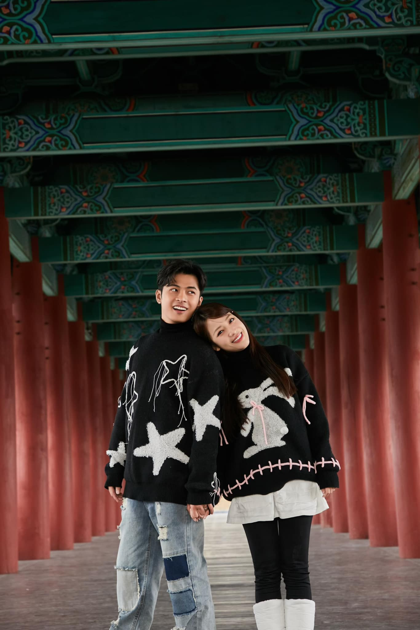 Khi cởi áo khoác ra, hai người lại có ngay một set đồ đôi khác là áo len đen. Xem ra hai vợ chồng chọn đồ rất khéo, màu sắc giống nhau nhưng họa tiết khác nhau để tạo sự đa dạng. Gin Tuấn Kiệt ngộ nghĩnh với những ngôi sao thì Puka lại đáng yêu với chú thỏ thắt nơ hồng.