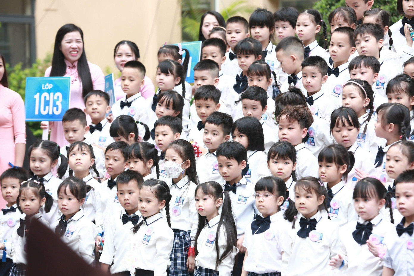 | Thầy cô, phụ huynh dẫn các em học sinh lớp 1 dự lễ khai giảng năm học mới. Ảnh: Bảo Anh |