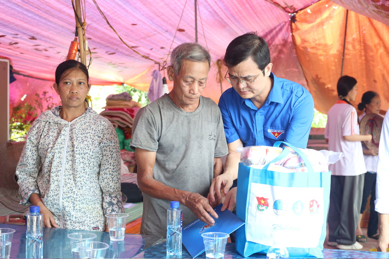 Đoàn công tác đã tới thăm gia đình ông Đinh Văn Thì, thuộc hộ cận nghèo ở thôn Thắng Trí, là hộ gia đình chịu thiệt hại lớn trong bão lũ. Cơn bão đi qua đã để lại nhiều thiệt hại nặng nề cho gia đình ông . Nhà cửa tan hoang, hoa màu đổ nát. Hiện tại gia đình ông gồm 4 thành viên phải dựng tạm tấm bạt trú tránh ở góc sân.