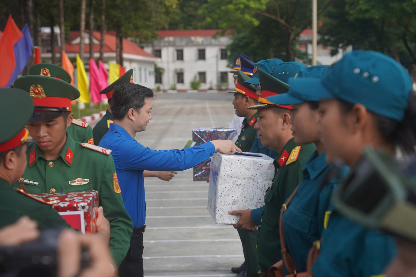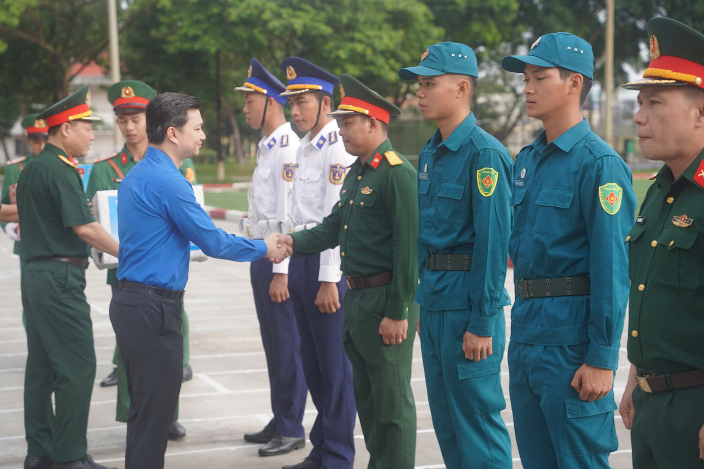 Tại Trường Quân sự Quân khu 7 (quận 12, TPHCM), đoàn đã đến thăm và tặng quà 8 khối lực lượng thanh niên Quân đội tham gia diễu binh, diễu hành của Bộ Quốc phòng.