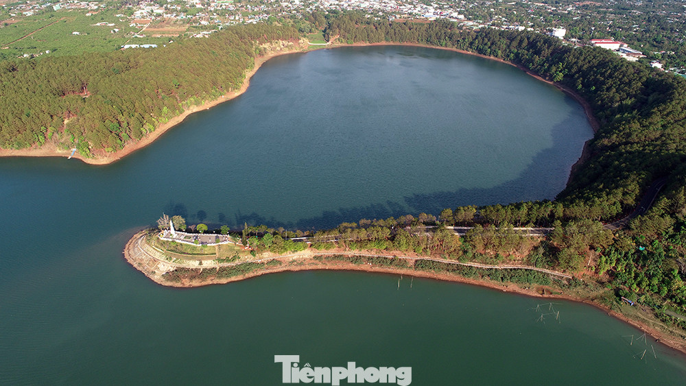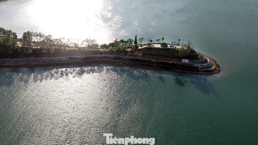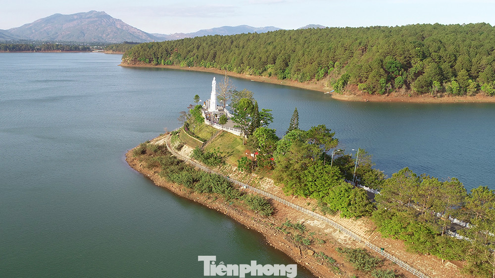 Trên dải đất ra lòng hồ là công trình tượng Quán Thế Âm Bồ Tát bằng đá cẩm thạch trắng, cao 15m, trở thành nơi du lịch tâm linh của phố núi.