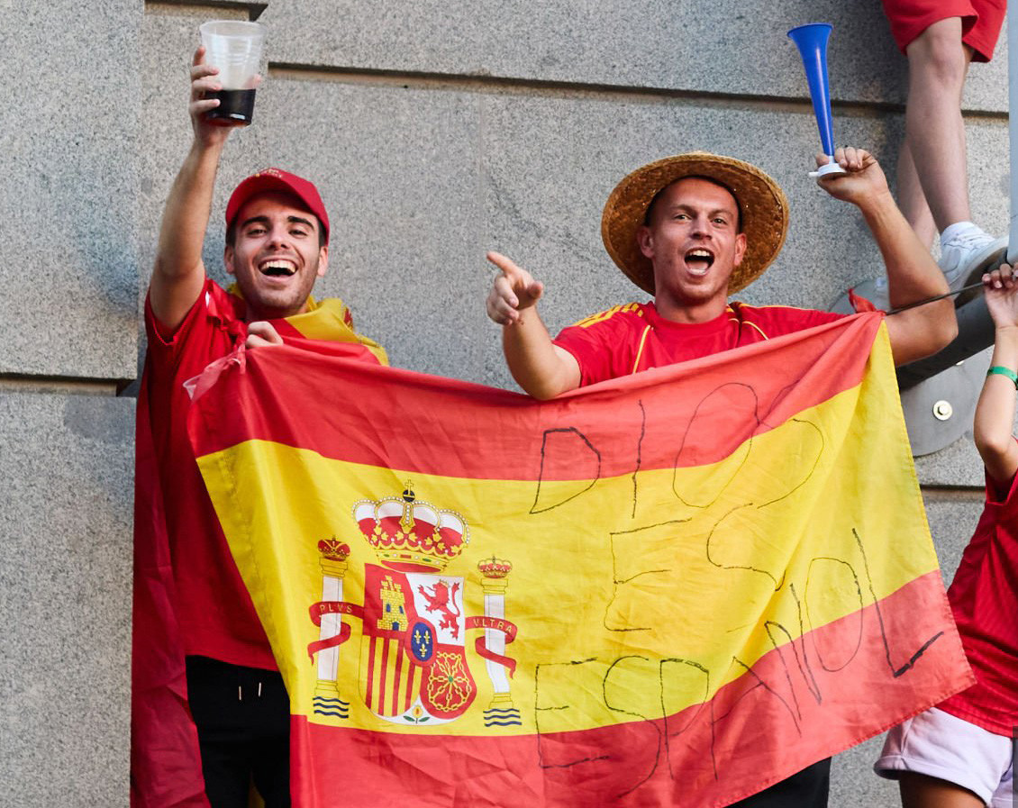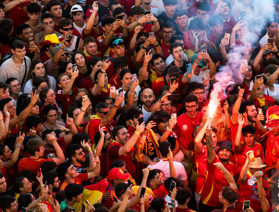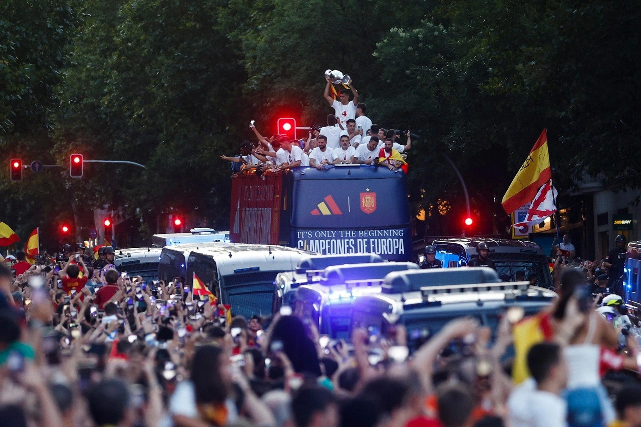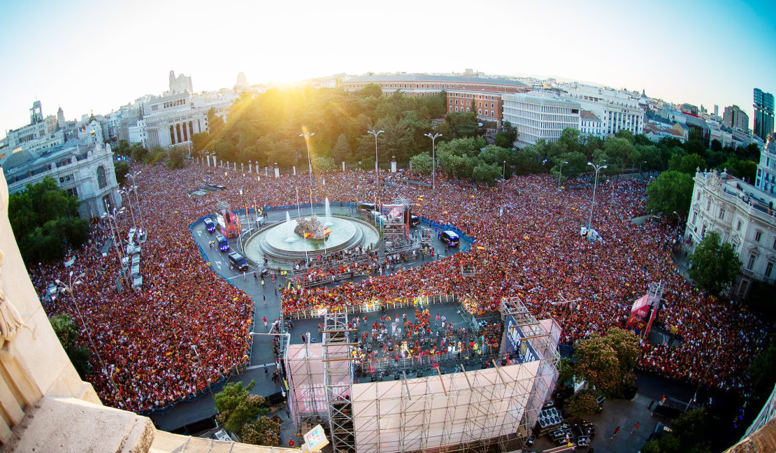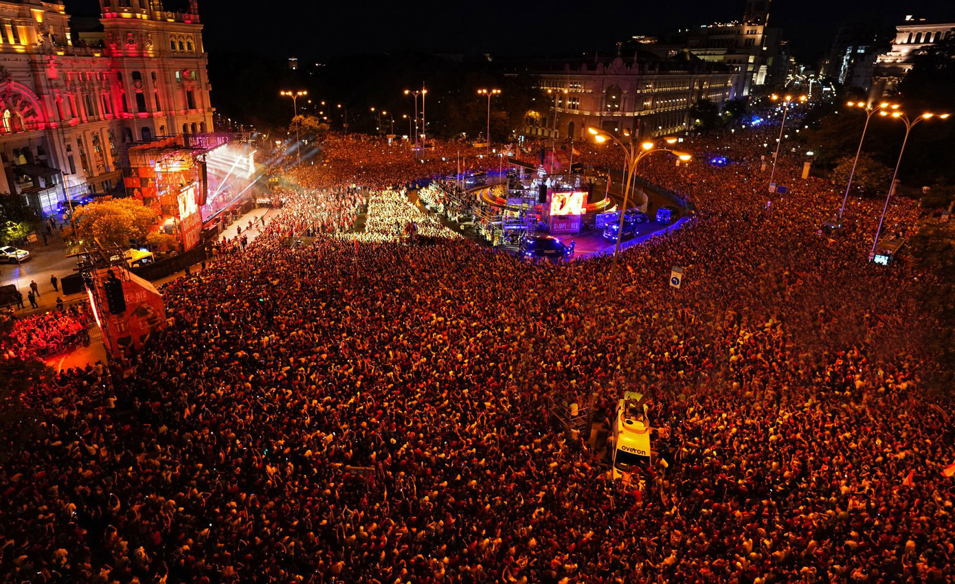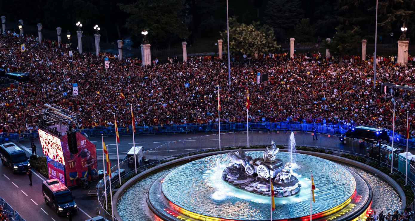 Tại đây, hàng vạn người mặc áo đỏ chờ đón họ, tất cả cùng hát vang. Các cầu thủ thay phiên nâng cup trên xe, và được hàng vạn người vây quanh hô tên. Trên xe, nhiều thành viên La Roja không ngần ngại giao lưu với NHM. Lamine Yamal thậm chí còn trổ tài ca hát.