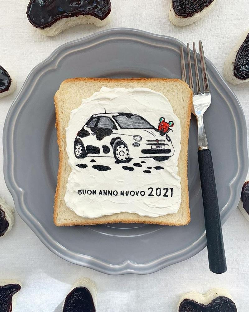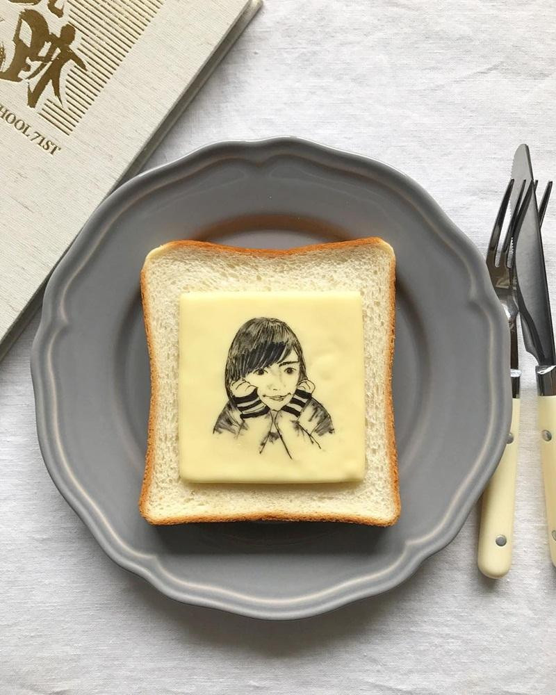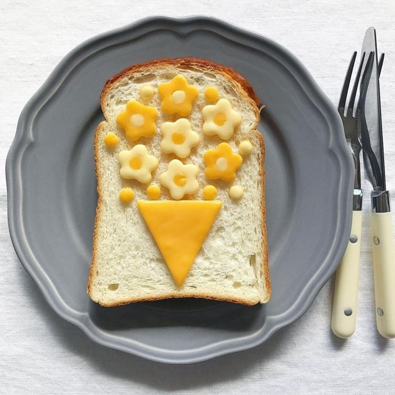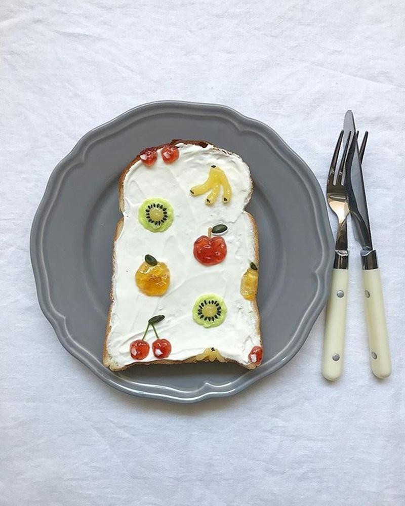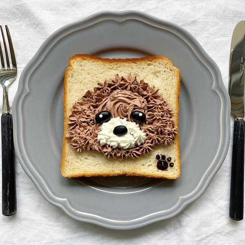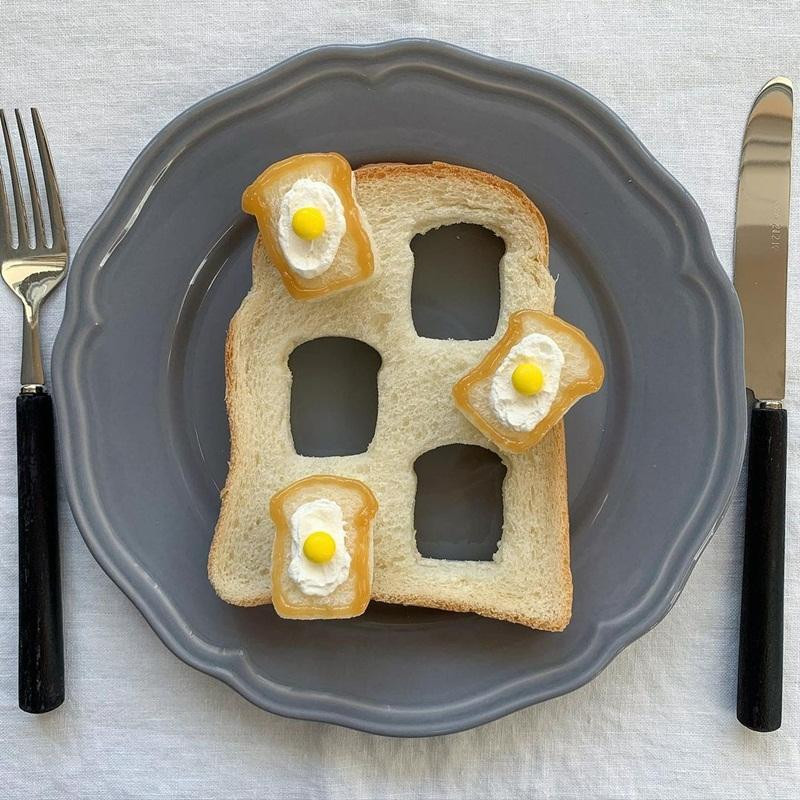 Vốn yêu thích làm bánh, Eiko Mori - một nghệ sĩ thị giác Nhật Bản bắt đầu bén duyên với việc “vẽ” trên những lát bánh mì vuông từ năm 2017. Ban đầu, Eiko Mori nghịch ngợm với những họa tiết đơn giản, vẽ những trái bơ, quýt chín mọng, chùm nho, kiwi... trên lớp kem chua.