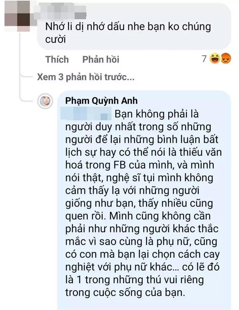 Nữ ca sĩ khẳng định, đây không phải lần đầu tiên có người nói chuyện thiếu văn hóa trên trang cá nhân của cô, nên cô đã thấy quen. Phạm Quỳnh Anh nhận định rằng, suy nghĩ cay nghiệt về người khác chính là thú vui trong cuộc sống của chủ nhân câu nói trên. Và nếu người này thấy ghét cô, không muốn đọc thì có thể bỏ qua tài khoản của Phạm Quỳnh Anh hoặc cứ thế lướt qua.