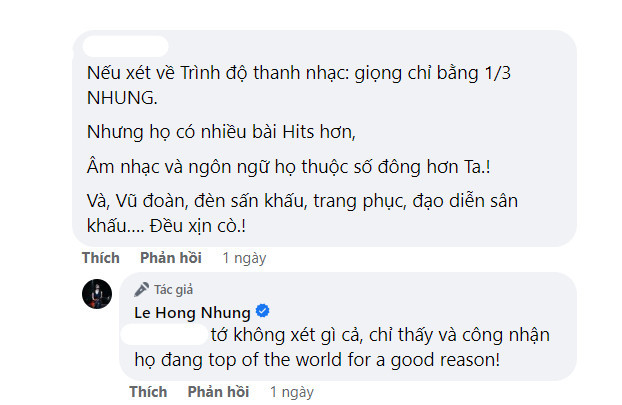 Đặc biệt, bài viết của Hồng Nhung trở nên "viral" trên mạng xã hội vì những phản hồi của cô về những ý kiến trái chiều liên quan tới BLACKPINK dưới phần bình luận. Nữ ca sĩ "ghi điểm" trả lời nhẹ nhàng, tinh tế và đưa ra những quan điểm khách quan, công tâm để bảo vệ BLACKPINK.