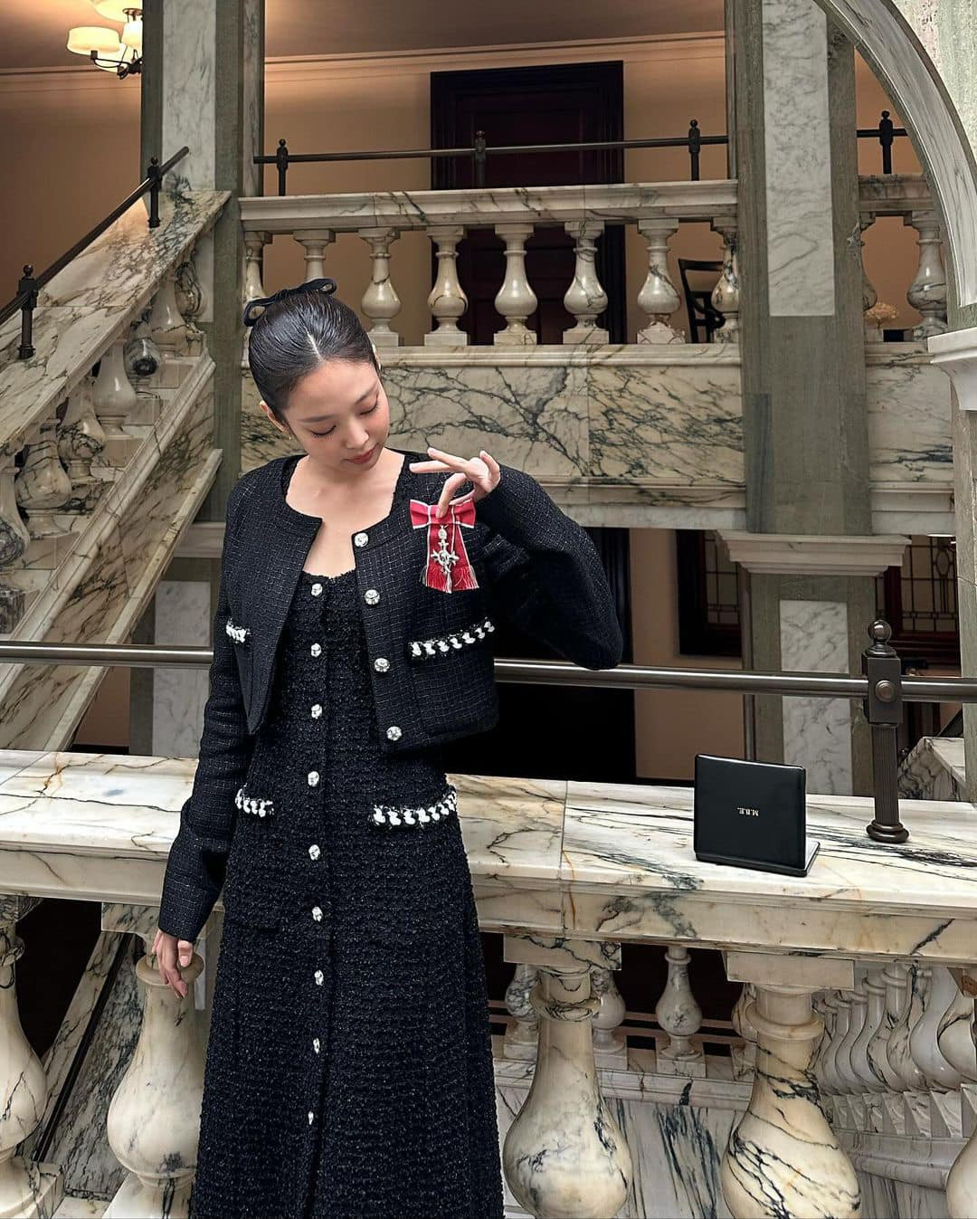 Như tổng hợp tất tần tật diễn biến của một ngày tại Cung điện Buckingham vừa qua, Jennie đăng một loạt ảnh với tạo hình từ quốc yến cho tới buổi nhận Huân chương. Ảnh cận chiếc thiệp mời, hình sắc nét chất lượng cao Huân chương MBE không thể thiếu.