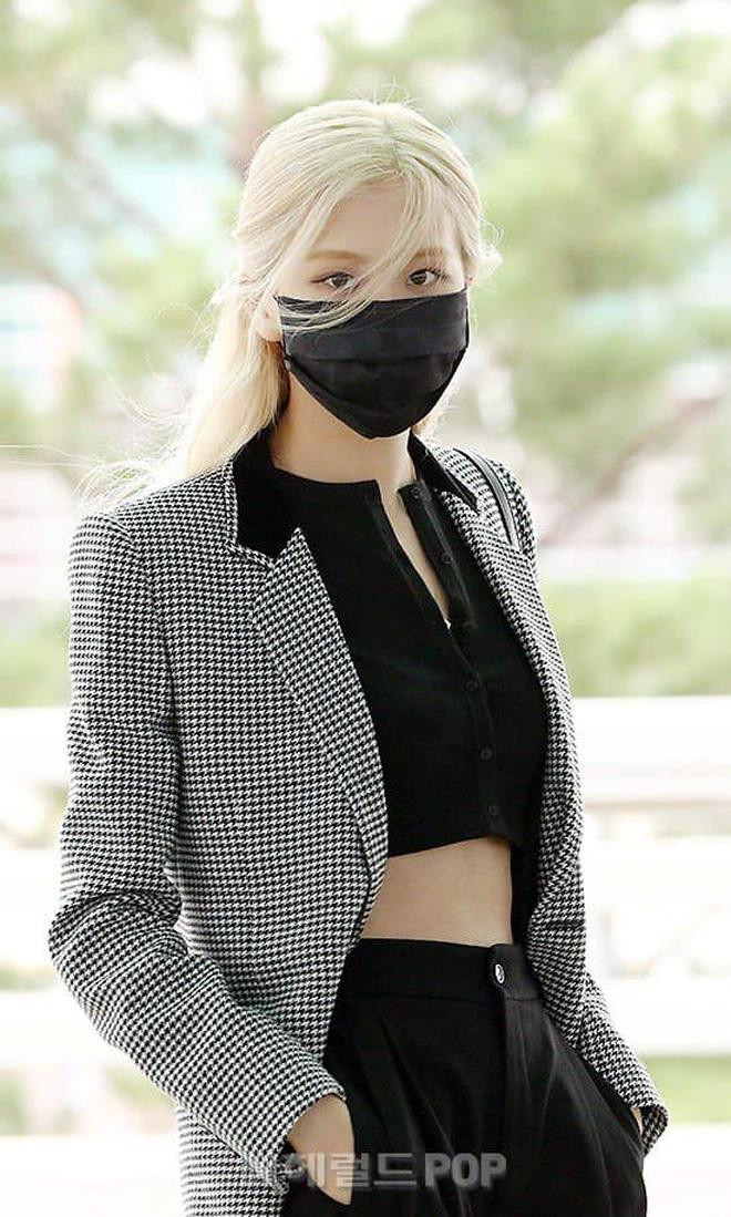 Dù diện đồ mang tông màu đen chủ đạo, đến khẩu trang cũng đen tuyền nhưng Rosé vẫn có điểm nhấn nổi bật là mái tóc vàng óng và đôi giày trắng tinh.