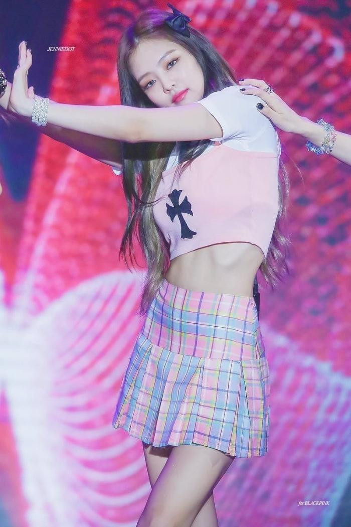 Bộ trang phục với áo crop-top đơn giản, chân váy kẻ xếp li cùng tông nhẹ nhàng. Với set đồ này, Jennie khoe được triệt để vòng eo nhỏ, và không cần thiết phải mặc thêm “phụ tùng” cho vòng 3 mà vẫn có được đường cong cơ thể xinh đẹp.