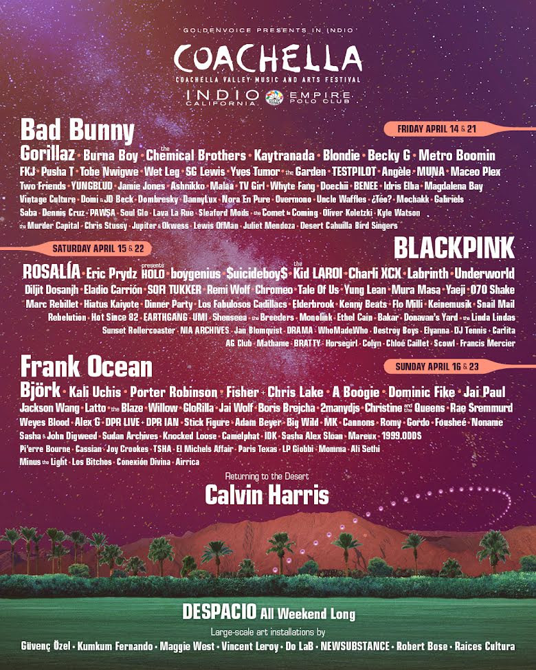 Ban tổ chức của Coachella đã xác nhận dàn nghệ sĩ biểu diễn tại lễ hội âm nhạc lớn nhất hành tinh năm nay. BLACKPINK là một trong 3 ngôi sao biểu diễn chính. Nhóm sẽ biểu diễn trong 2 ngày 15/4 và 22/4.