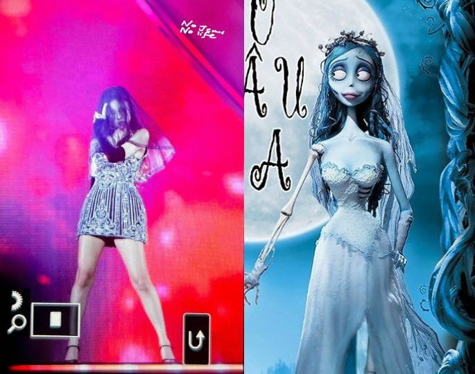 Không phải trang phục mang phong cách balletcore, ở đêm diễn cuối cùng của chuyến lưu diễn lần này, Jennie mang đến outfit độc đáo với khăn voan trùm trong phần trình diễn solo. Người hâm mộ "điêu đứng" vì dáng vẻ ma mị của Jennie giống như cô dâu ma Emily trong phim hoạt hình The Corpse Bride.