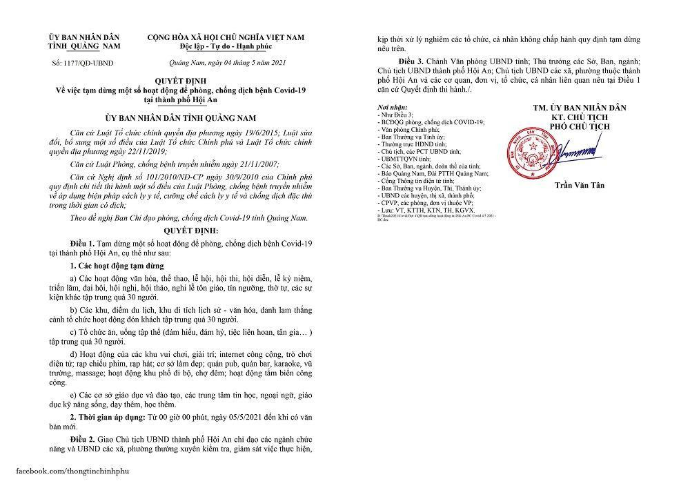 Cũng trong tối 4/5, UBND Tỉnh Quảng Nam đã đưa ra công văn yêu cầu thành phố Hội An tạm dừng tất cả các hoạt động vui chơi giải trí, internet công cộng, tắm biển, hoạt động phố đi bộ, chợ đêm,.... và tránh tập trung quá 30 người kể từ 0 giờ 00 phút ngày 5/5 cho tới khi có thông báo mới.