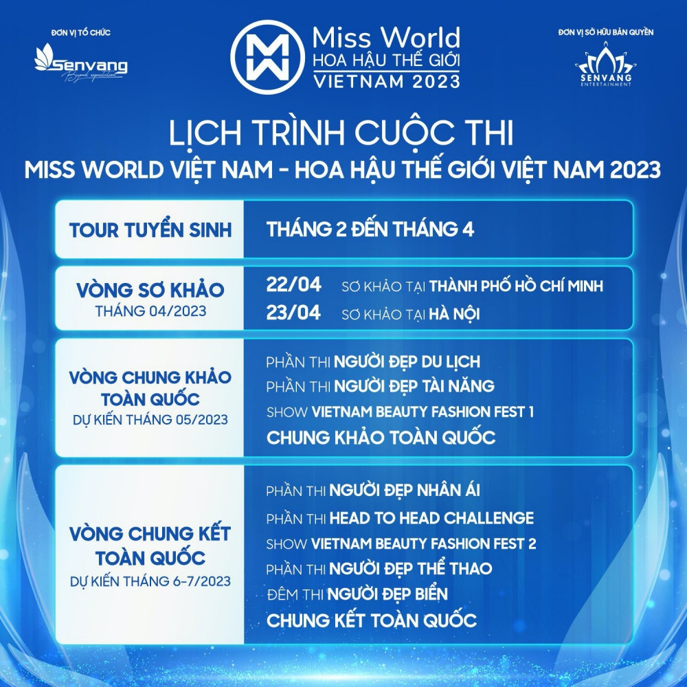 Đại diện BTC Miss World Việt Nam, Hoa hậu Mai Phương đã trình bày lịch trình sắp tới của cuộc thi năm nay. Theo đó MWVN 2023 sẽ được diễn ra từ tháng 4 đến tháng 7/2023. Giai đoạn tuyển sinh sẽ được diễn ra trên khắp cả nước từ tháng 2 - 4/2023.