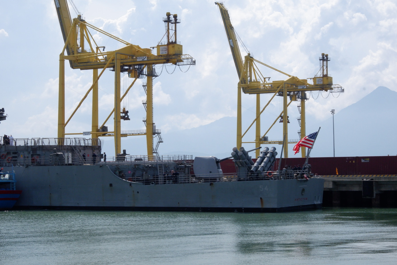 Hai tàu tuần dương USS Antietam (CG-54) và USS Robert Smalls (CG-62) hộ tống tàu sân bay USS Ronald Reagan đến Đà Nẵng. Khi tàu sân bay đã neo đậu ở vịnh Đà Nẵng, 2 tàu tuần dương mới từ từ tiến vào neo ở cầu cảng Tiên Sa. Ảnh: Nguyễn Thành