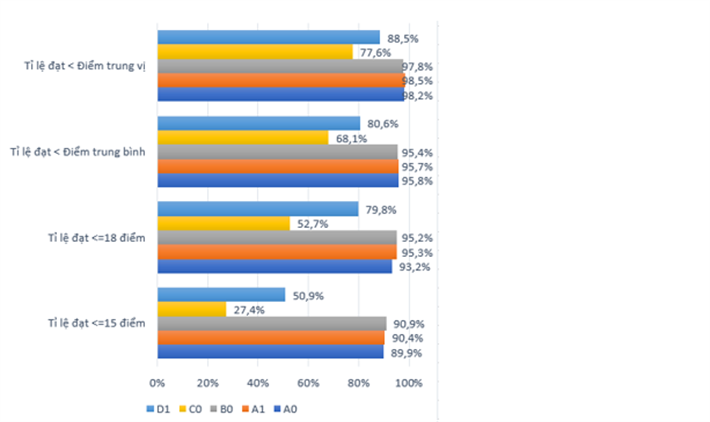 Nhất là ở các khối A0, A1 và B0 thì các mức điểm đại đa số là rất thấp, thấp hơn mức điểm trung vị, điểm trung bình và thấp hơn 15 điểm/ tổ hợp.