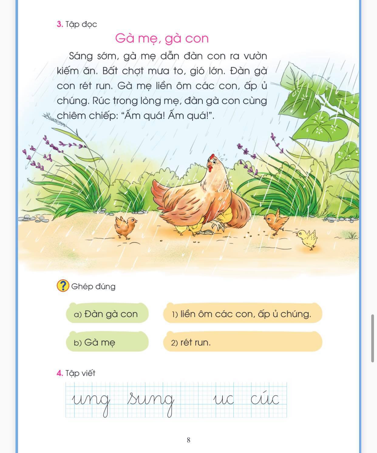 Theo đó, bản chỉnh sửa dài 12 trang, trong đó thay thế 12 bài đọc như: Lỡ tí ti mà (trang 53) thay bằng bài Nhớ bố; bài Ve và gà (trang 67) thay bằng bài Bờ Hồ; Cua, cò và đàn cá 1 (trang 115) thay bằng bài Kết bạn; Cua, cò và đàn cá 2 (trang 117) thay bằng bài Hồ Sen; Hai con ngựa 1 (trang 157) thay bằng bài Gà mẹ, gà con…