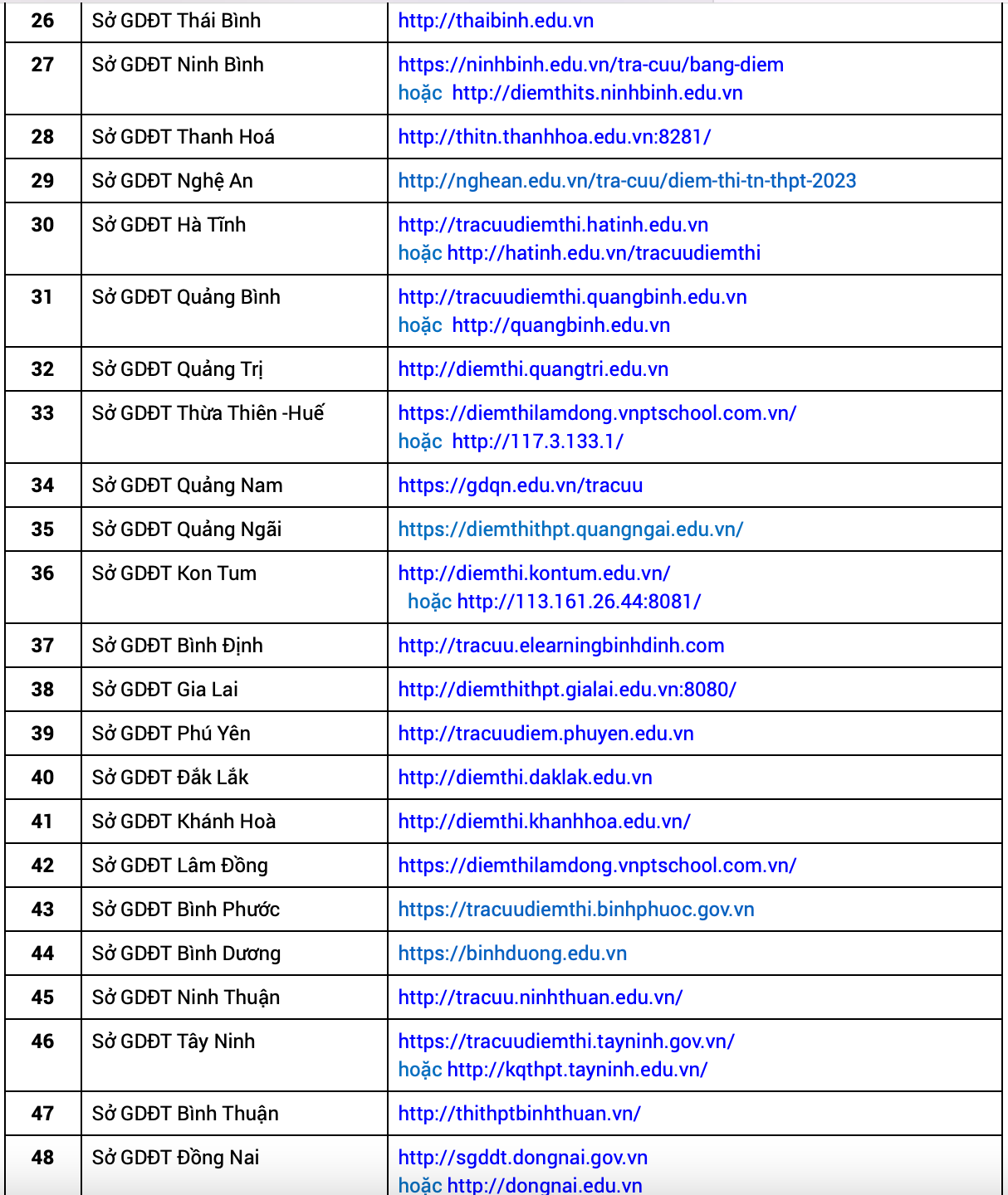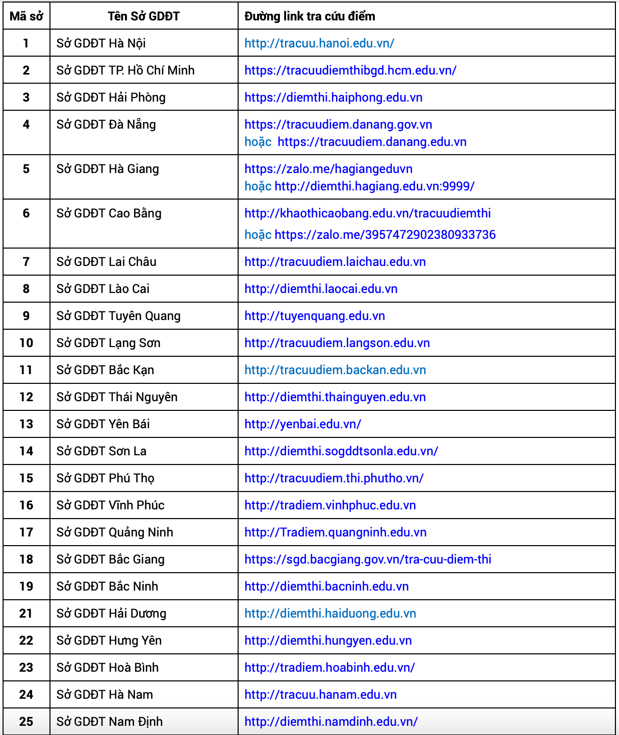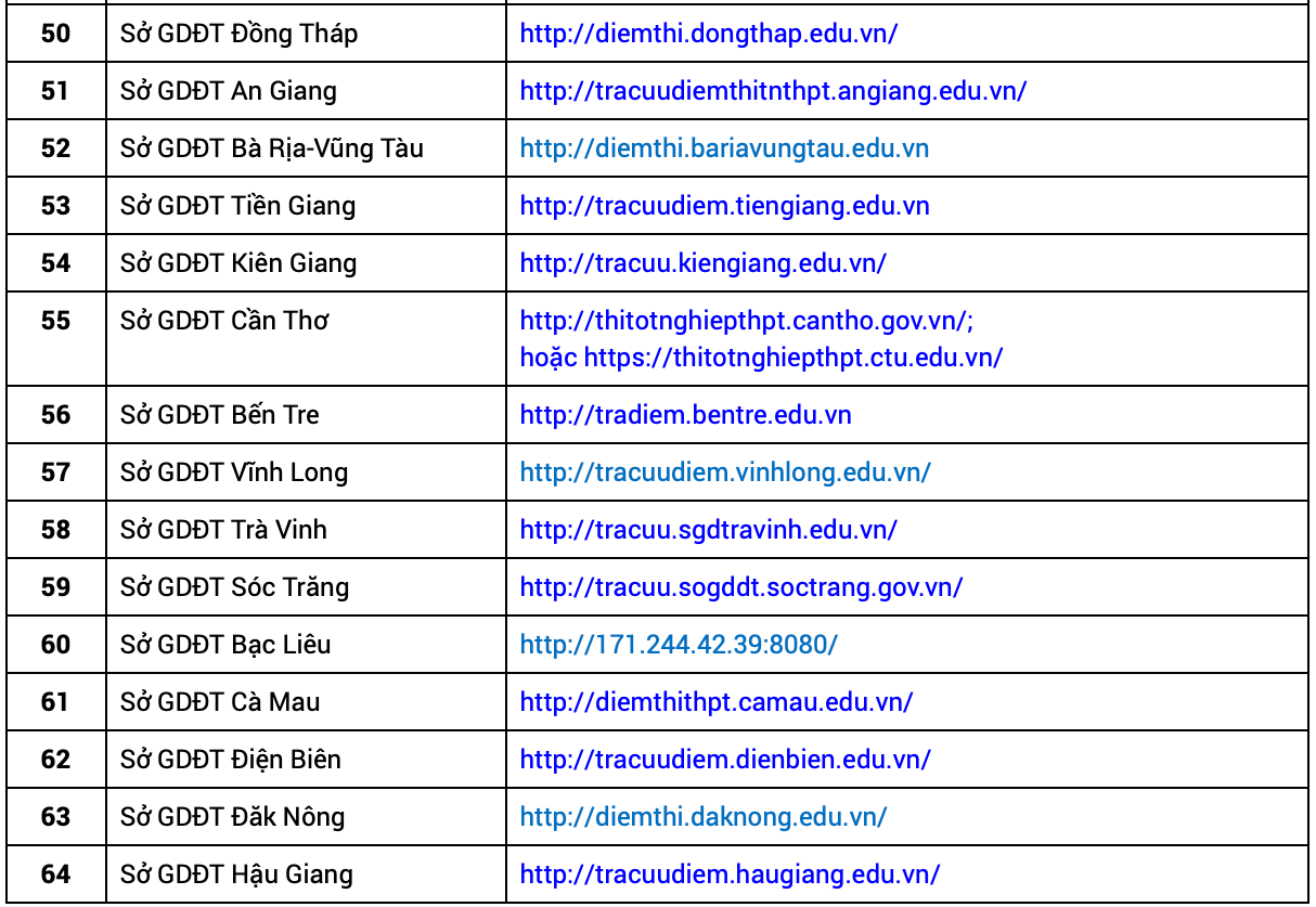 Danh sách website của Sở GD&ĐT các tỉnh, thành phố cụ thể: