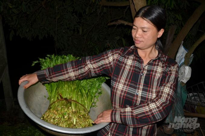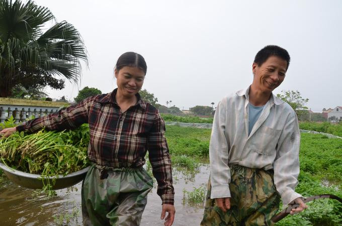 Vợ chồng chị Quy đang thu hái rau cần. Ảnh: Dương Đình Tường.
