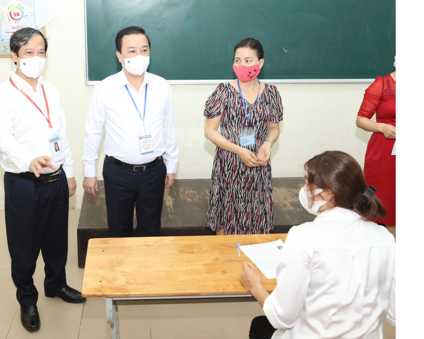 Tới động viên các em học sinh tại một số phòng thi, Bộ trưởng Nguyễn Kim Sơn chúc các em thí sinh bình tĩnh và làm bài thi thật tốt.