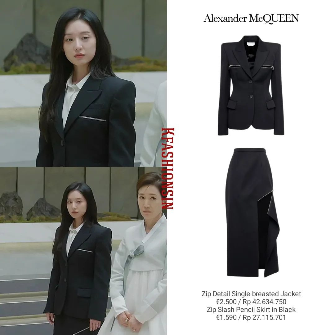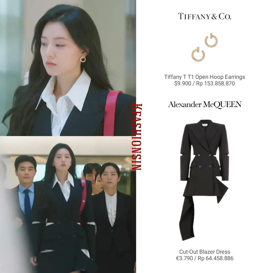 | Nhân vật Hae In trong set suit họa tiết của Alexander McQUEEN có giá 245 triệu đồng, tạo điểm nhấn với khuyên tai hơn 160 triệu đồng. |