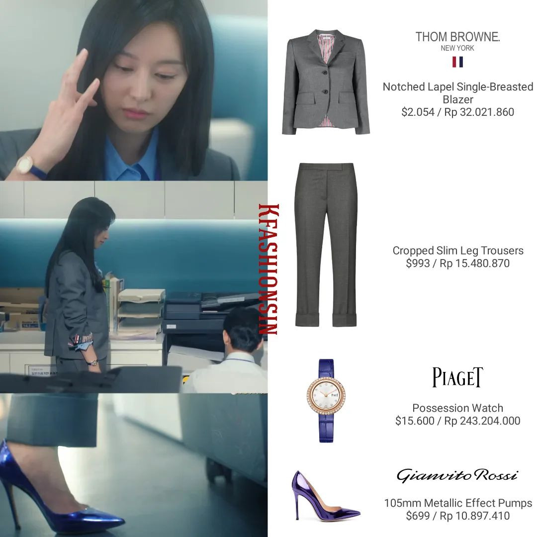 Các set trang phục công sở có giá "sương sương" hơn 110 triệu đồng của nhà mốt Alexander McQUEEN, hơn 75 triệu đồng của thương hiệu Thom Browne. Cô thực tập sinh lộ thân phận khi đeo đồng hồ PIAGET giá gần 385 triệu đồng.
