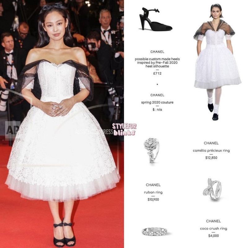 Jennie đi đôi giày nằm trong BST Pre-Fall 2020 có giá gần 21 triệu đồng. Cô đeo ba chiếc nhẫn vô cùng đắt giá: Chiếc nhẫn đính kim cương hình hoa trà có giá lên tới hơn 300 triệu đồng, chiếc nhẫn hình nơ có giá gần 256 triệu đồng và chiếc nhẫn dòng coco crush có giá gần 94 triệu đồng.