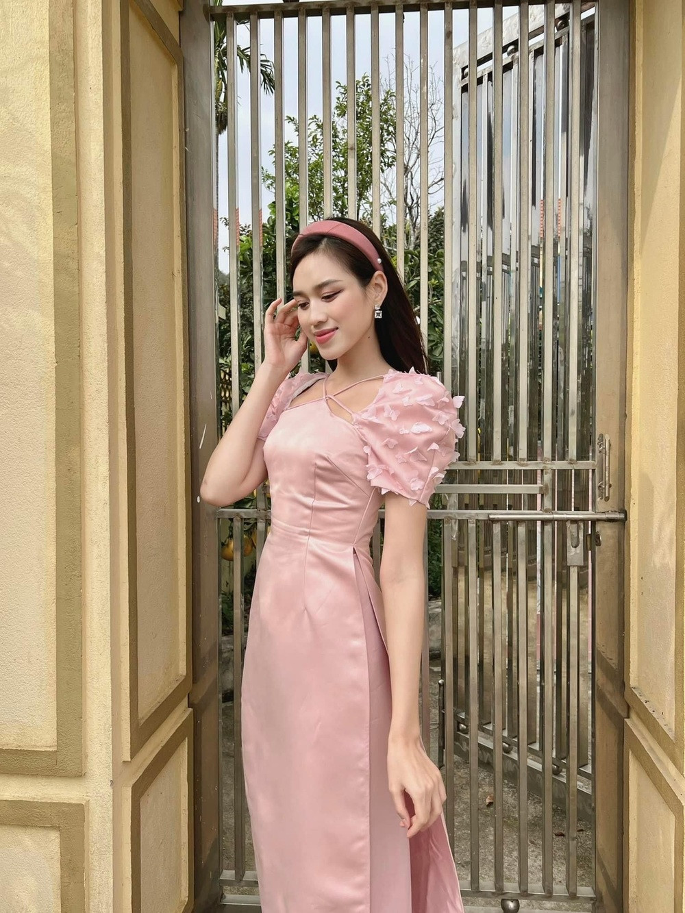 Còn Đỗ Thị Hà cũng chọn áo dài hồng nhạt nhưng lại có thiết kế cổ yếm đi kèm tay bồng điệu đà, giúp nàng hậu nhìn đầy ngọt ngào, trong trẻo trong những ngày đầu năm.