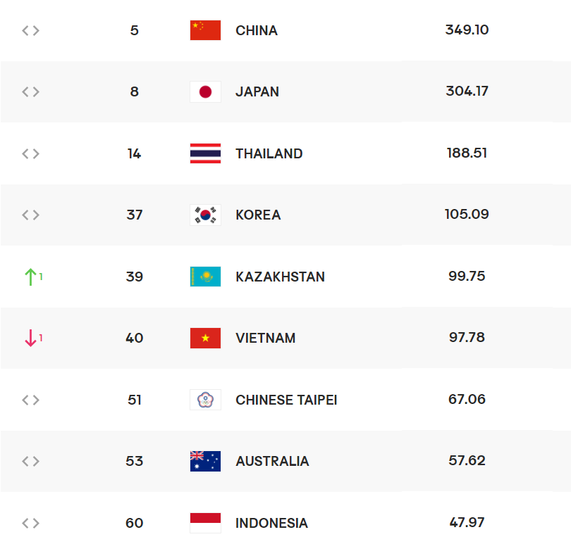 Hiện tại, tuyển bóng chuyền nữ Việt Nam đã rơi xuống hạng 40, trả lại hạng 39 cho Kazakhstan sau khi đội bóng này thắng đậm Ấn Độ 3-0. Với việc phải gặp Thái Lan ở trận hạ màn vòng bảng tối nay, tuyển nữ Việt Nam có nguy cơ bị trừ điểm và đứng yên ở vị trí này.