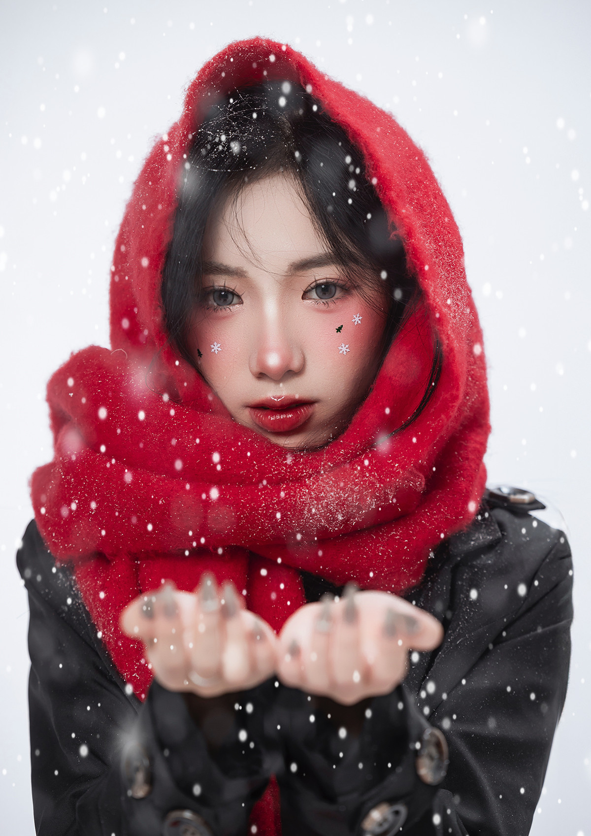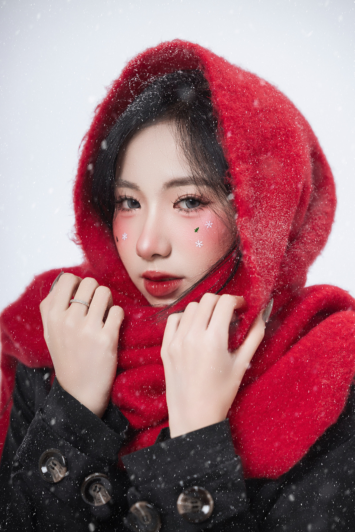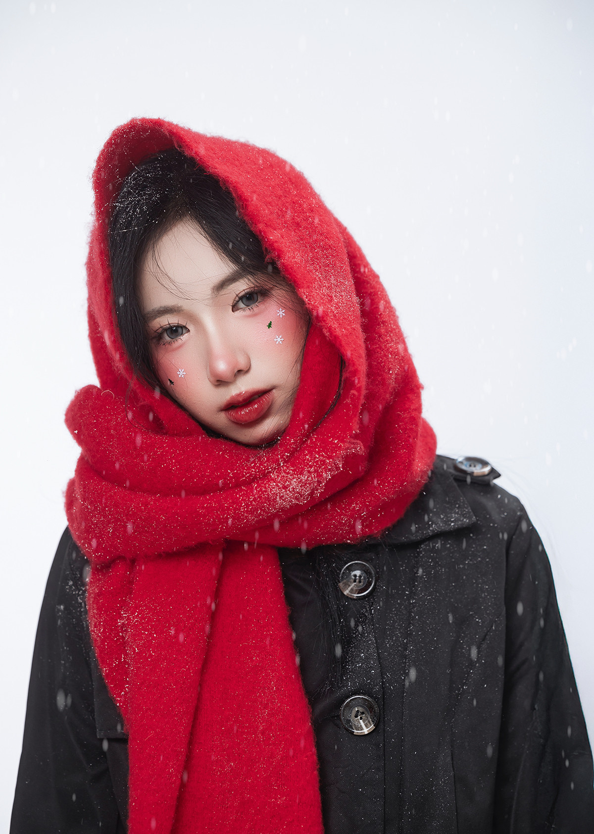 Khăn đỏ, biểu tượng cho sự ấm áp và niềm vui, kết hợp hoàn hảo với họa tiết bông tuyết, nhấn mạnh tinh thần đoàn viên và khát khao chúc mừng mùa lễ hội. Những khoảnh khắc an lành và ấm áp trong bộ ảnh khiến người xem cảm nhận rõ rệt về sự gần gũi và tình cảm gia đình trong dịp lễ đặc biệt này.